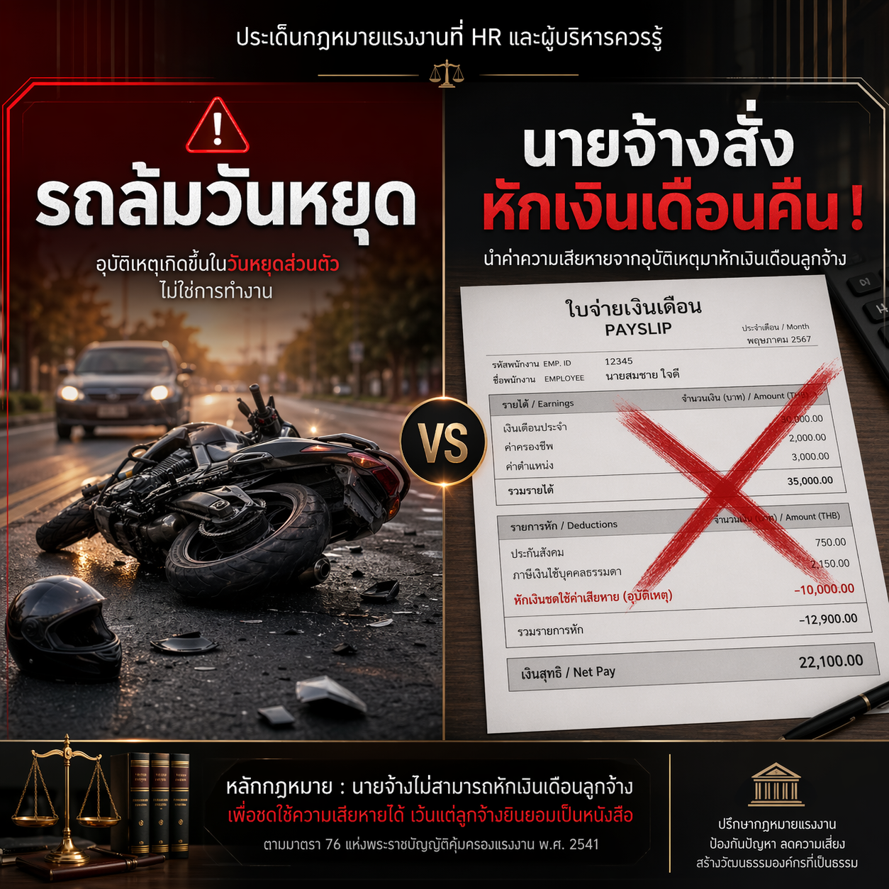 สถานการณ์: นายเก่ง พนักงานขับรถ ประสบอุบัติเหตุขี่รถจักรยานยนต์ล้มในวันหยุด ไม่เกี่ยวกับการทำงาน บาดเจ็บจนต้องพักฟื้น 50 วัน ฝ่าย HR จ่ายค่าจ้างตามปกติตลอด 50 วัน เมื่อผู้บริหารทราบในภายหลัง จึงสั่งเรียกเงินเดือนคืนทั้งหมด 50 วัน โดยให้หักจากเงินเดือนงวดถัดไปแบ่ง 10 งวด