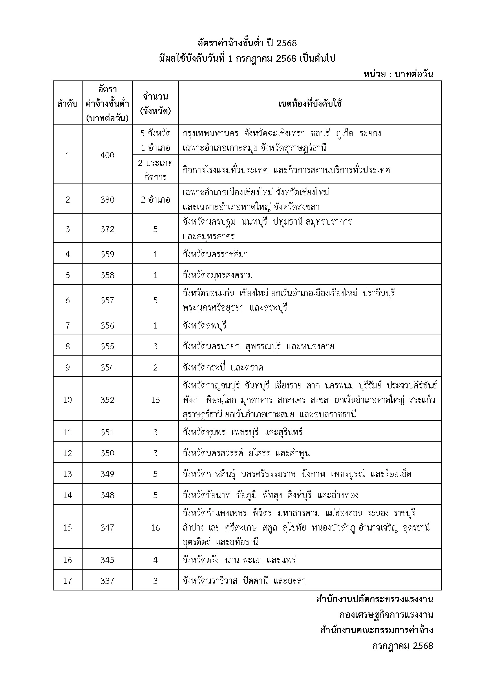 สรุปอัตราค่าจ้างขั้นต่ำใหม่ (มีผล 1 ก.ค. 68)